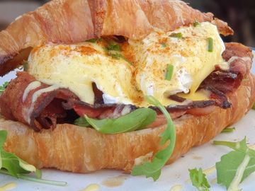 Poached eggs, crispy bacon, house-made hollandaise, rocket, cheddar and fresh chives on a toasted croissant