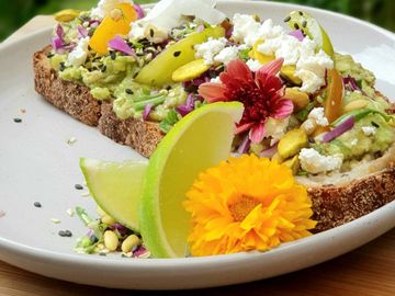Avocado, pickled radish, micro greens, whipped feta and lime on seeded sourdough