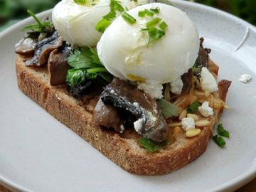 Sage & garlic mushroom medley, enoki, spinach, persian feta, white truffle oil, roasted pine nuts with poached eggs on rye sourdough