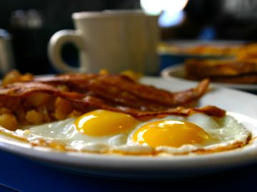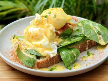 Two poaches eggs, house-made hollandaise & greens served on toasted sourdough with crispy bacon