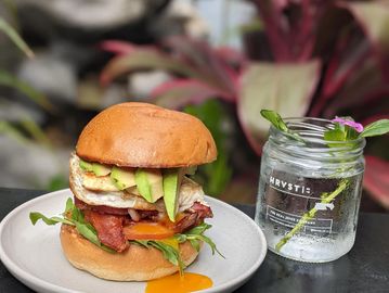 Crispy bacon, hamoumi, fried egg, tomato, rocket and chipotle mayo on a tosted milk bun