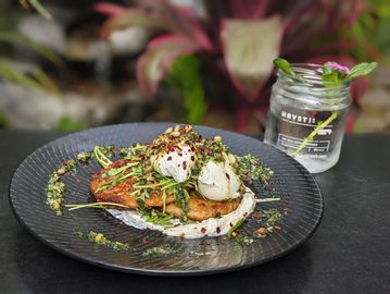 Double stack of grilled potato and onion rosti, green basil pesto, herbed labneh, two soft poached eggs with rocket, paprika and lime.